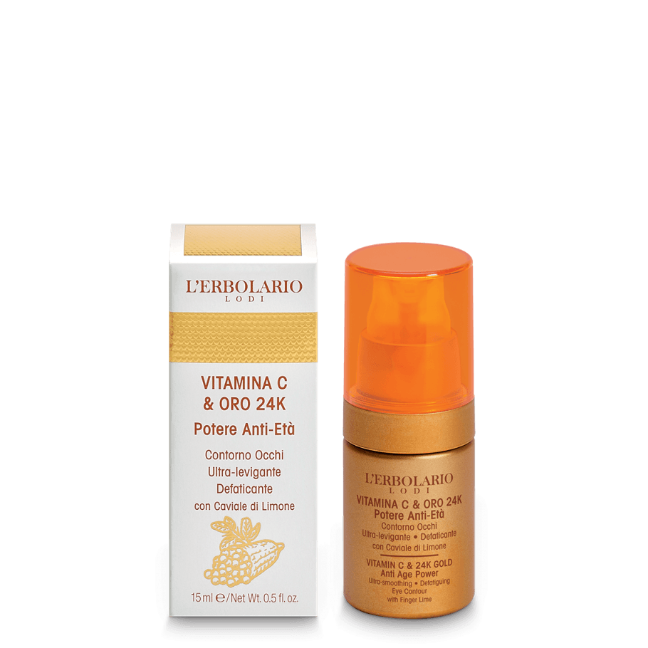 Vitamina C coniugata con Oro 24 carati, estratti di Caviale di Limone, foglie di Lime, foglie e rametti di Limone, succo di Pompelmo rosa, acqua distillata di Hamamelis, acqua distillata di fiori d’Arancio amaro, Caffeina da semi di Caffè verde, Acido Ialuronico ultrafiller, Vitamina E dai semi della Soja.