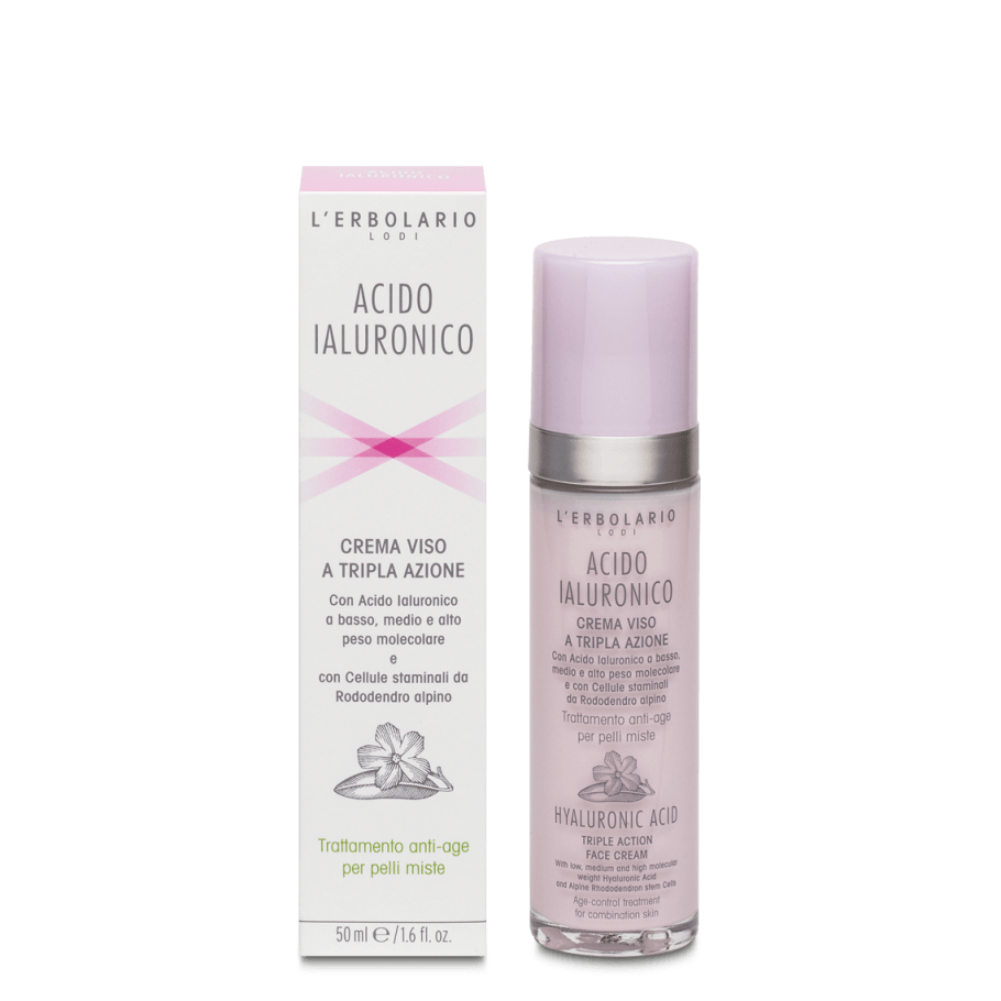 Acido Ialuronico a basso, medio e alto peso molecolare, cellule staminali da foglie di Rododendro alpino, estratto di Epilobio, olio di Babassu, frazione insaponificabile dell’olio di Oliva, Vitamina E dai semi della Soja, olio essenziale di fiori di Ylang Ylang