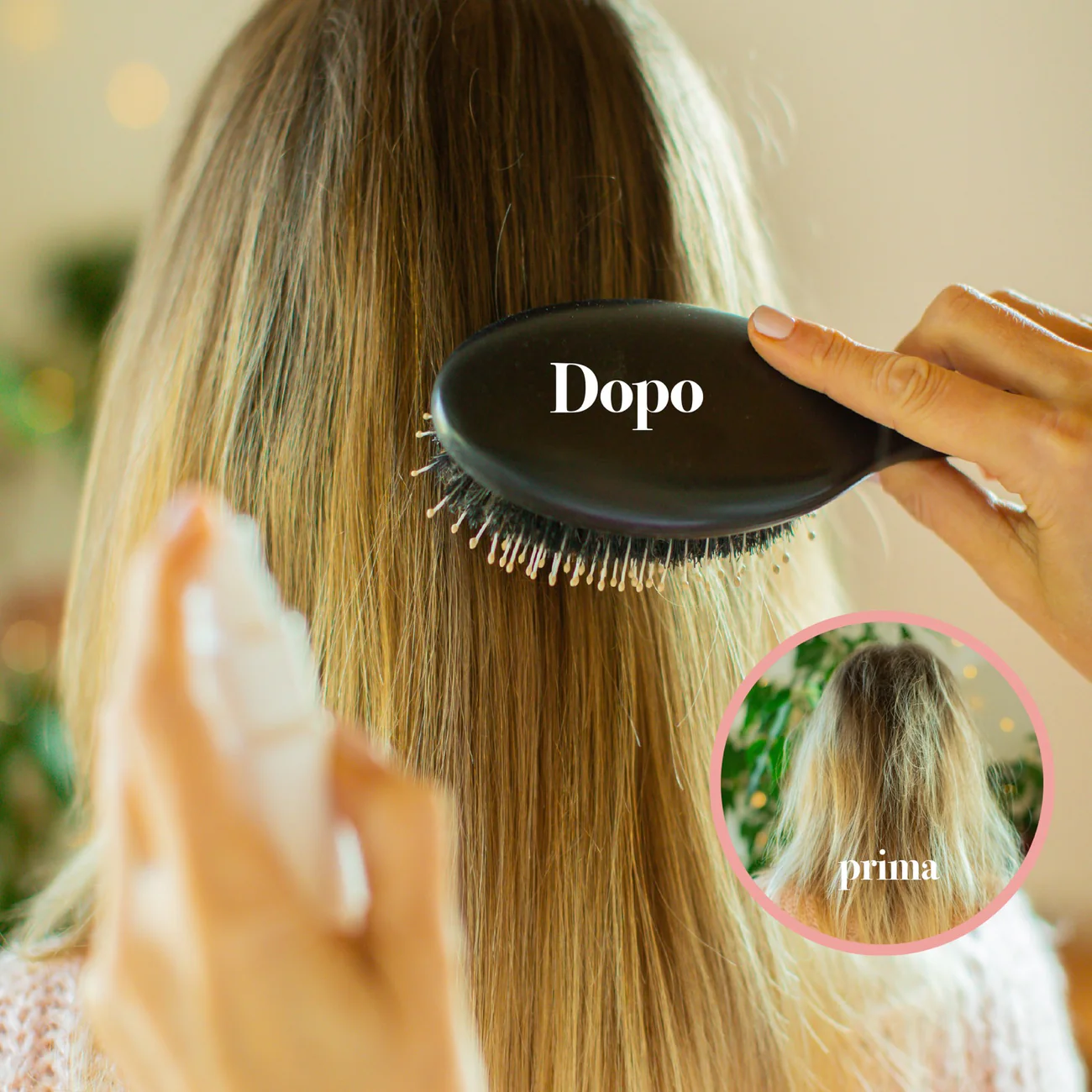 Spray gloss quotidiano con azione anticrespo, da vaporizzare sui capelli sempre a fine asciugatura per completare il look e donare lucentezza.